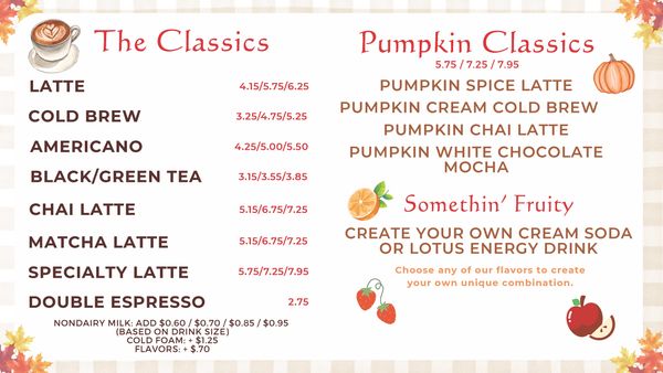 We’re proud to serve your favorite drinks all year long! Browse our current and past menus to find something you love — or, if nothing catches your eye, take a look at our flavor list and craft your own custom creation!